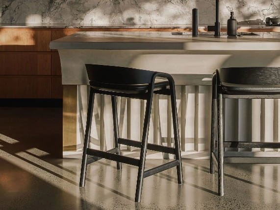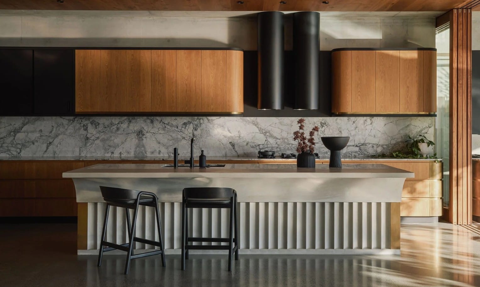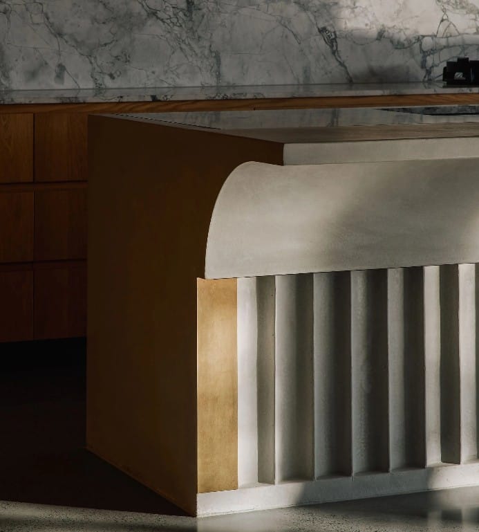 At Corso House, the kitchen island becomes a sculptural focal point within the space. Fabricated by Mixed Element, the fluted concrete island was produced using GFRC (Glass Fibre Reinforced Concrete) supplied by Domcrete. The vertical fluting creates a rhythmic texture that interacts with light throughout the day, giving the island a sense of movement while maintaining the solid, grounded presence that concrete brings to an interior. Achieving this level of detail in concrete requires careful mould design and precise casting, as the fluted geometry must remain consistent across the entire piece.