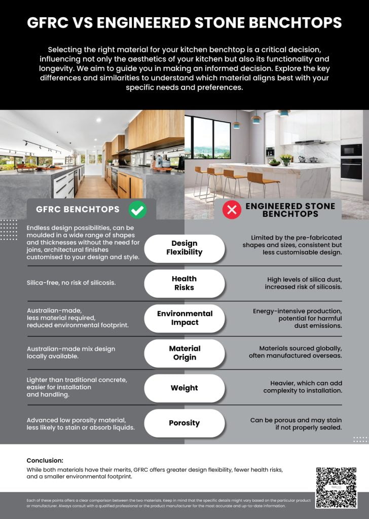 GFRC provides an innovative and safer alternative for kitchen benchtops. With its design flexibility, customised finishes, silica-free composition, Australian-made quality, and mouldable nature, it’s a choice that combines style, safety, and sustainability.